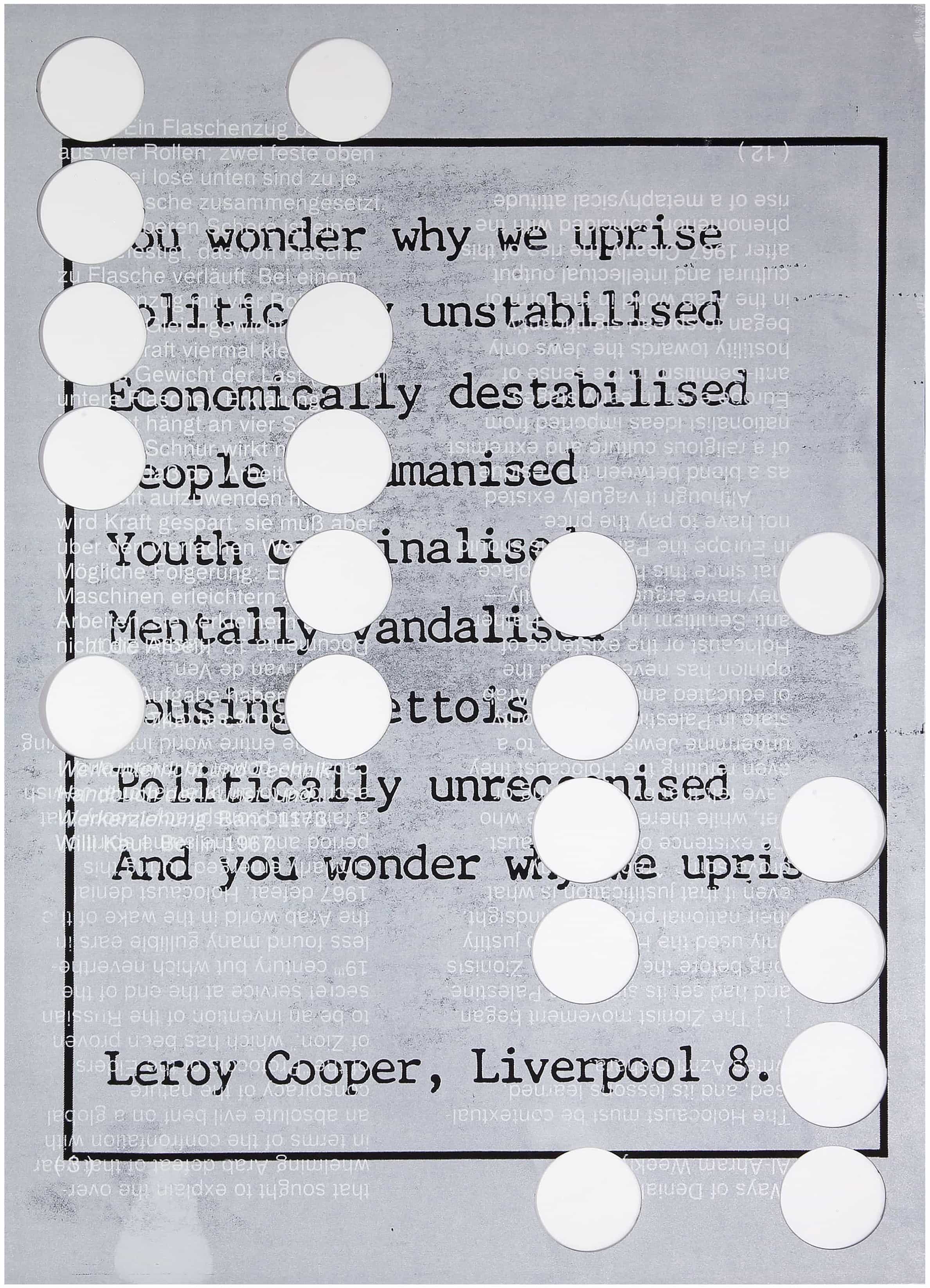 Test prints that were generated during the printing process of A GESTURAL HISTORY OF THE YOUNG WORKER (2019), an installation by Werker, are invalidated by punch holes. While the original documents lose their didactic function, other forms of value appear in the abstracted and commodified artwork.