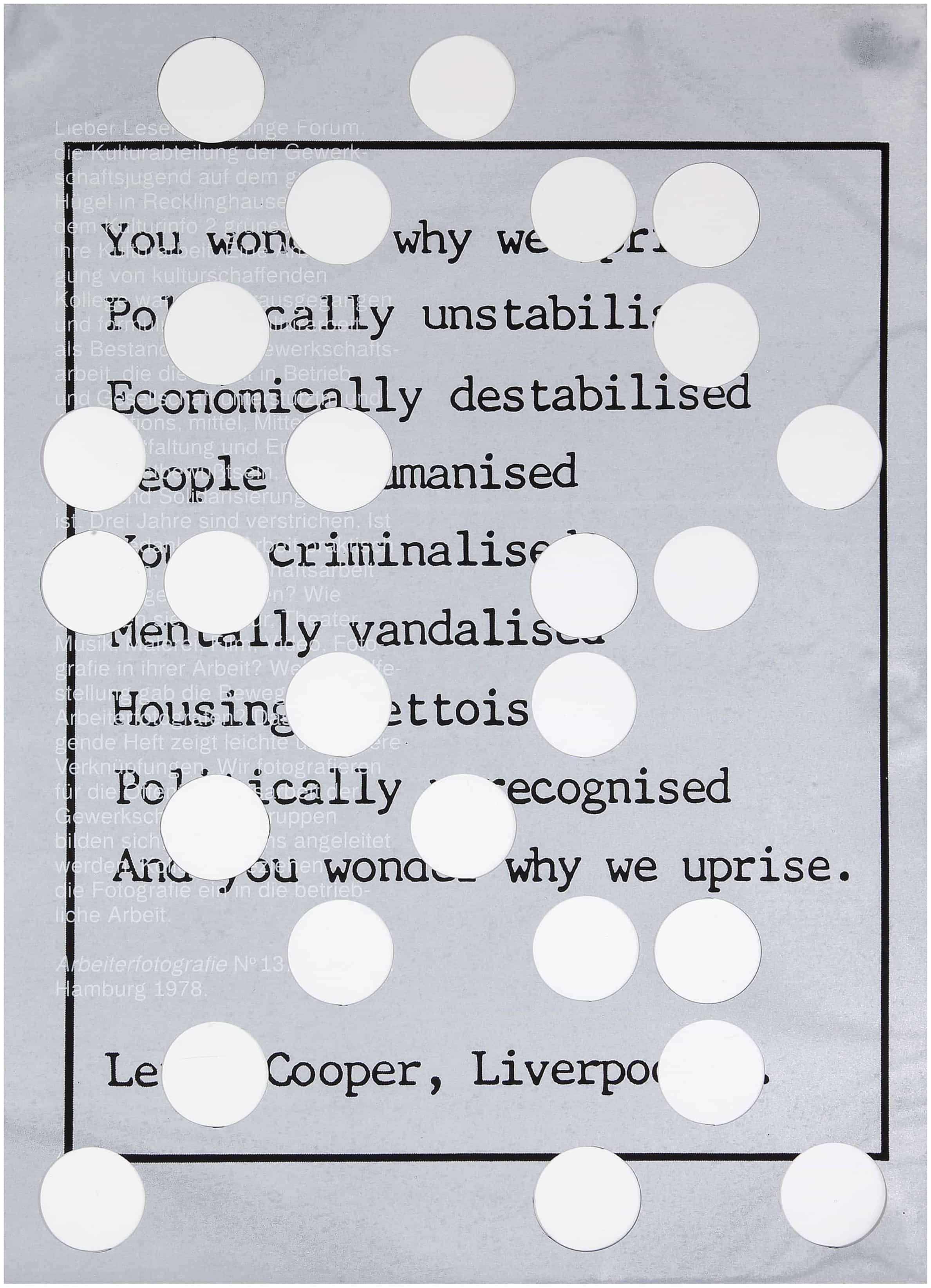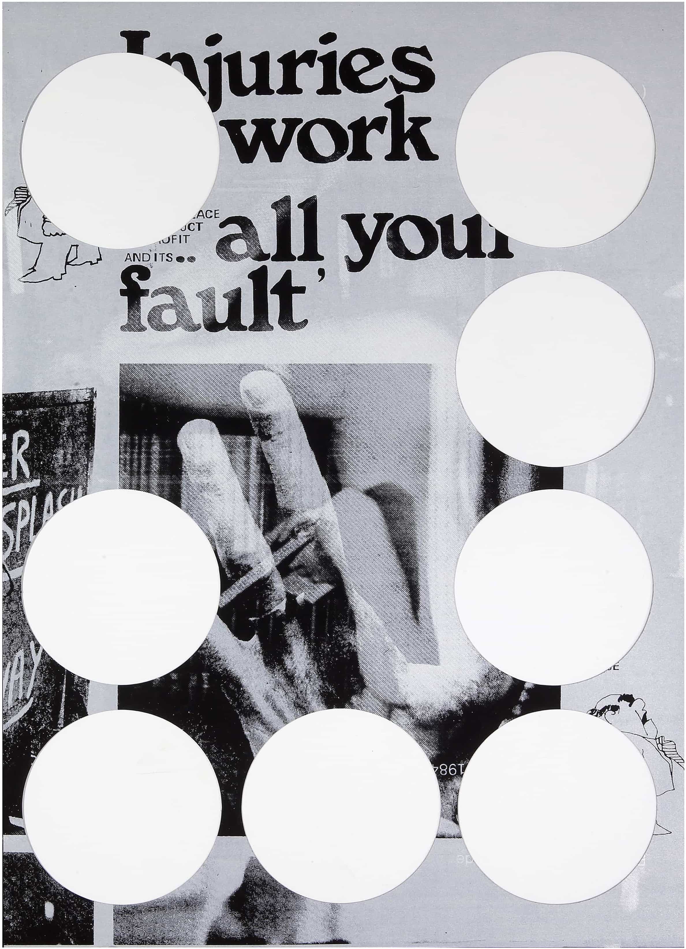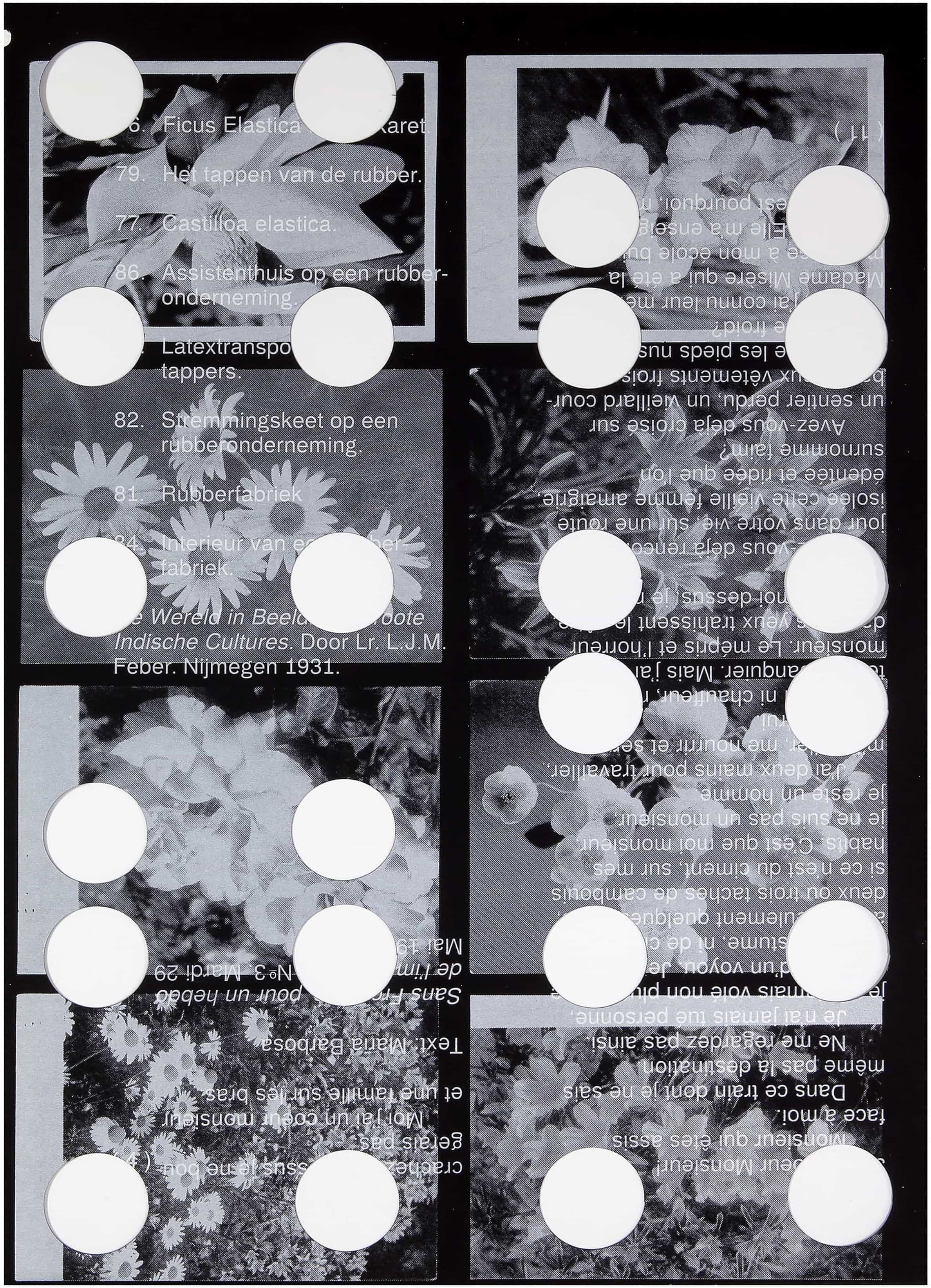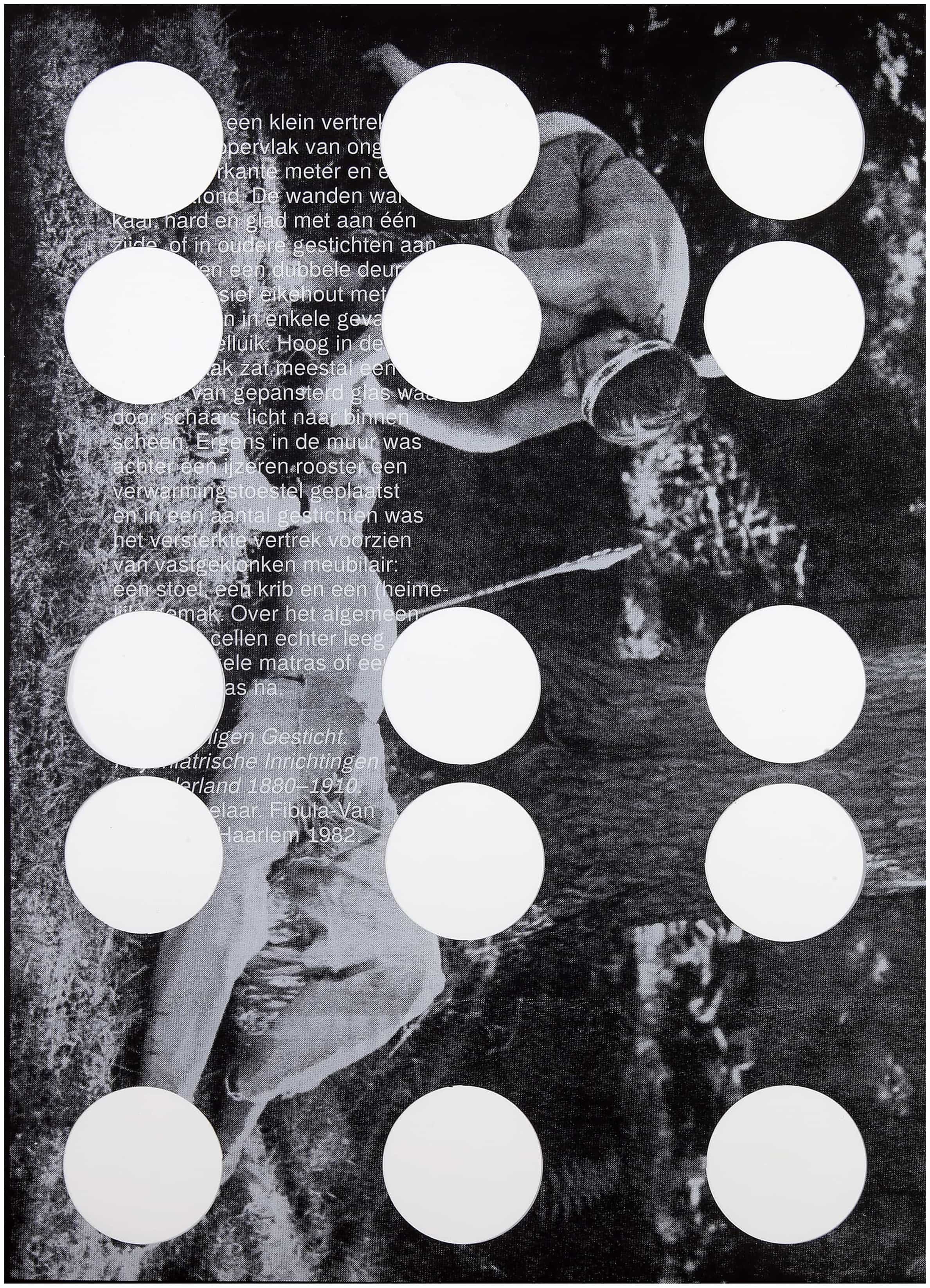 Test prints that were generated during the printing process of A GESTURAL HISTORY OF THE YOUNG WORKER (2019), an installation by Werker, are invalidated by punch holes. While the original documents lose their didactic function, other forms of value appear in the abstracted and commodified artwork.